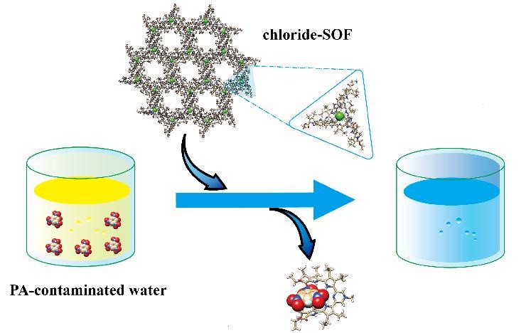 Supramolecular organic framework (SOF) materials, known for their high crystallinity and reusability, hold significant potential in applications such as gas separation, molecular recognition, and photocatalysis. In these contexts, SOF materials typically rely on their porous nature, and the degradation of the material often leads to functional decline or loss. However, recent research by Professor Zhang Zhan's team and Professor Sessler has revealed that the deformation and disassembly of SOF materials could instead serve as advantageous factors in molecular recognition. They synthesized a chloride-SOF material based on the coordination of chloride ions with flexible oligopyrroles. Due to multiple interactions between individual oligopyrrole molecules and the A–B–C stacking mode of the two-dimensional honeycomb layers, the crystalline chloride-SOF exhibits excellent thermal stability and maintains its structure during desolvation. Upon contact with picric acid molecules, this material disassembles and releases monomers, encapsulating and recognizing the picric acid molecules through anion exchange and adaptive structural transformation. This process forms a perfectly shape-matched supramolecular complex with multiple interactions, enabling highly efficient capture of picric acid molecules in water. Under this mechanism, the chloride-SOF material achieves a capture efficiency of over 99.99% for picric acid in water, significantly surpassing conventional covalent organic frameworks (COF), metal-organic frameworks (MOF), and porous organic polymers. After treatment with this material, the picric acid concentration in contaminated water can be reduced from 100 mg/L to the ng/L (ppt) level.