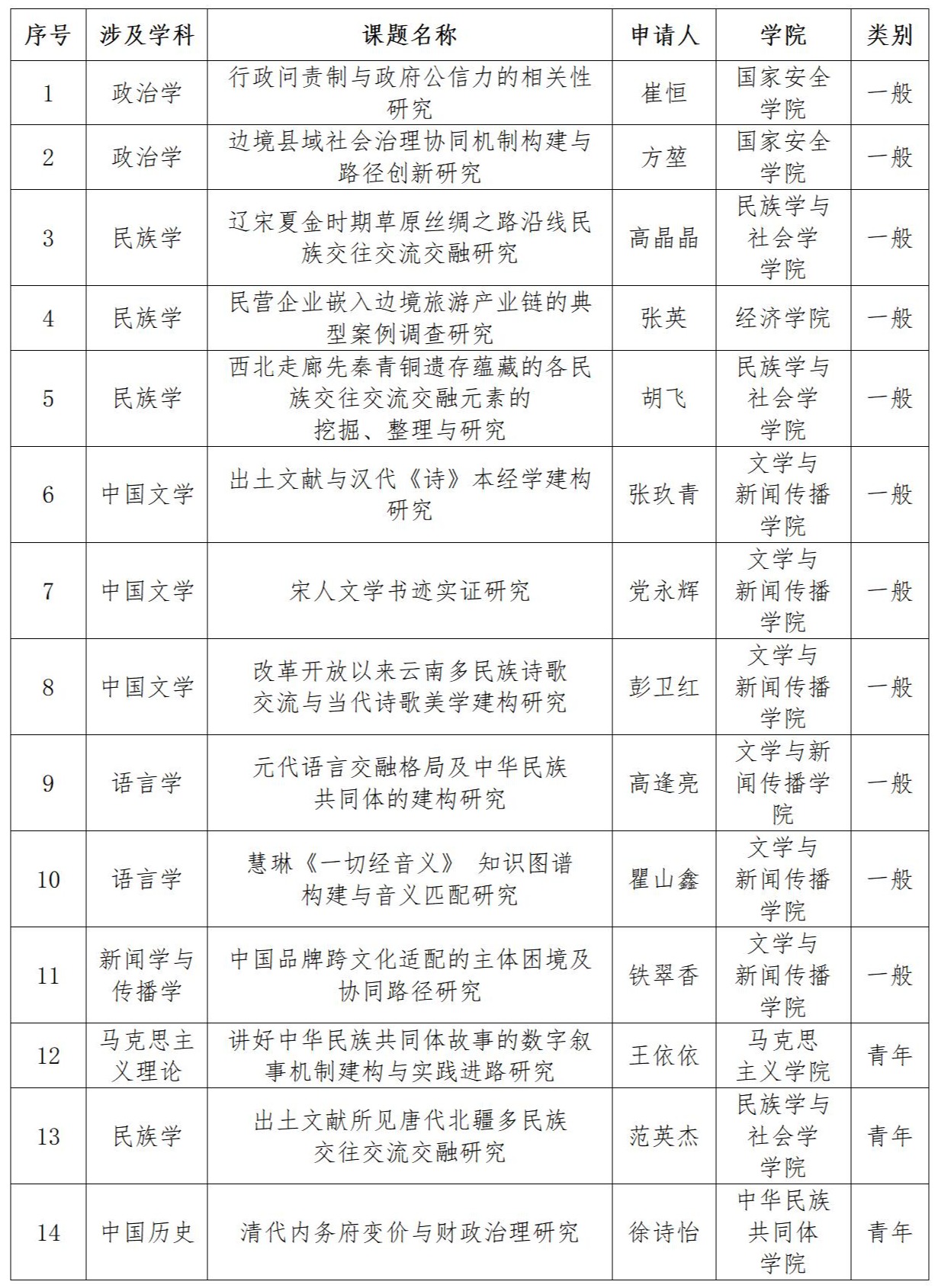 The approved annual projects of the National Social Science Fund for this year span seven disciplines, with four in Ethnology, three in Chinese Literature, two each in Linguistics and Political Science, and one each in Marxist Theory, Journalism and Communication, and Chinese History.